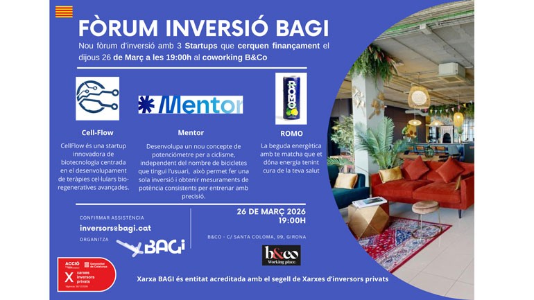 BAGI, la Xarxa d'Inversors de Girona, us convida a un nou Fòrum d'Inversió on presentaran 3 projectes emprenedors en busca de finançament. Seran Cell-Flow; Mentor i Romodrinks