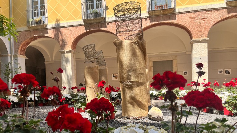 Dins la mostra "Girona, temps de flors" el claustre del Centre Cultural La Mercè acull la instal·lació floral realitzada pels alumnes de Batxillerat artístic de l'Institut S. Sobrequés amb la col·laboració de la Fundació Infància i Família.