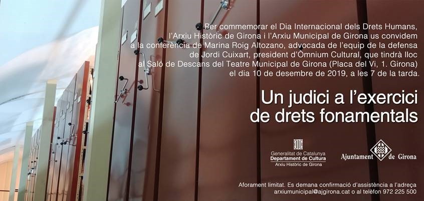 Per commemorar el Dia Internacional dels Drets Humans, l'Arxiu Històric de Girona i l'Arxiu Municipal organitzen la conferència de Marina Roig Altozano, advocada de l'equip de la defensa de Jordi Cuixart, sobre la vulneració dels drets humans en el judici als dirigents independentistes del "procés" al Tribunal Suprem d'Espanya.