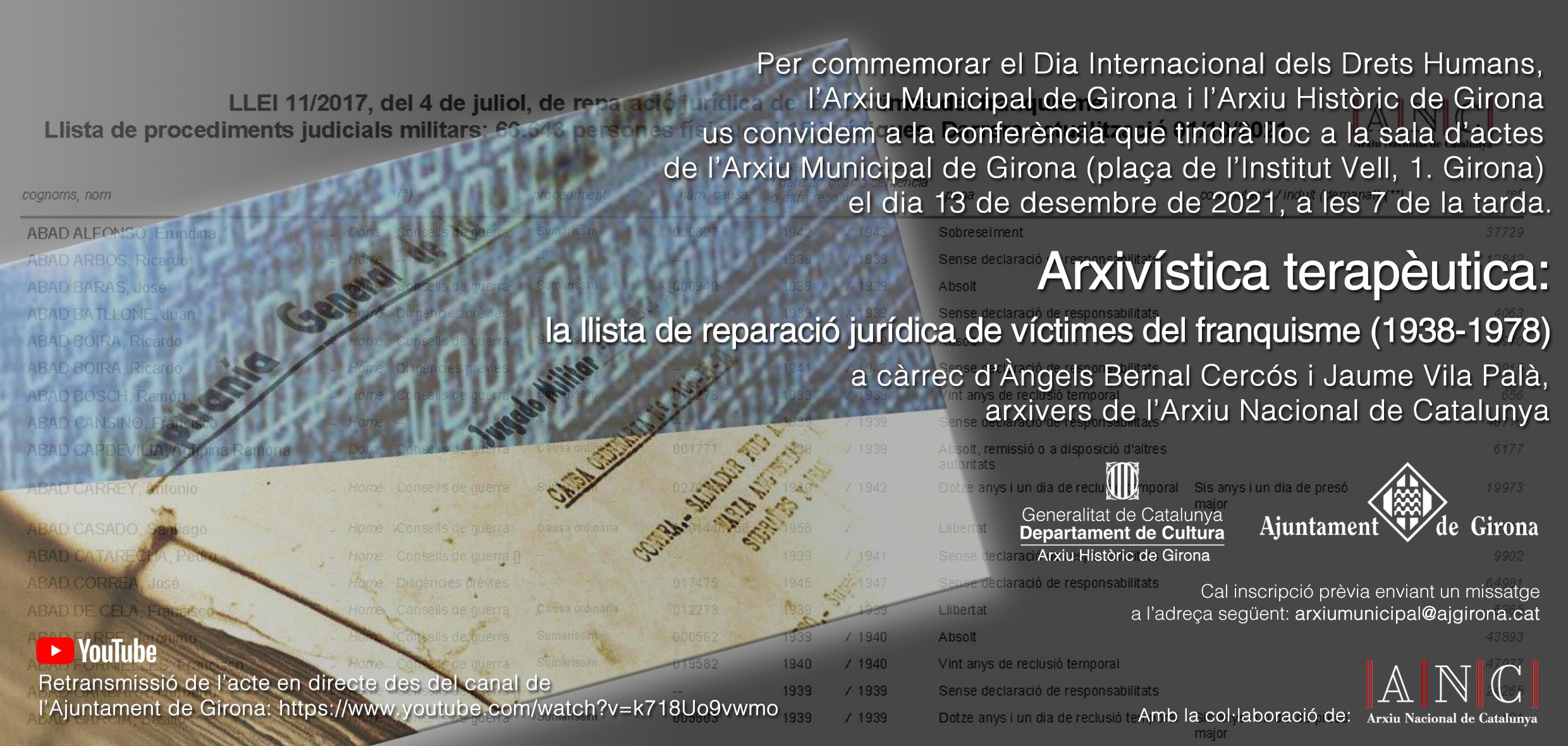 Per commemorar el Dia Internacional dels Drets Humans, l'Arxiu Municipal de Girona i l'Arxiu Històric de Girona organitzen la conferencia Arxivística terapèutica: La llista de reparació de víctimes del franqusime (1938-1978) a càrrec d'Àngels Bernal Cercós i Jaume Vila Palà, arxivers de l'Arxiu Nacional de Catalunya.