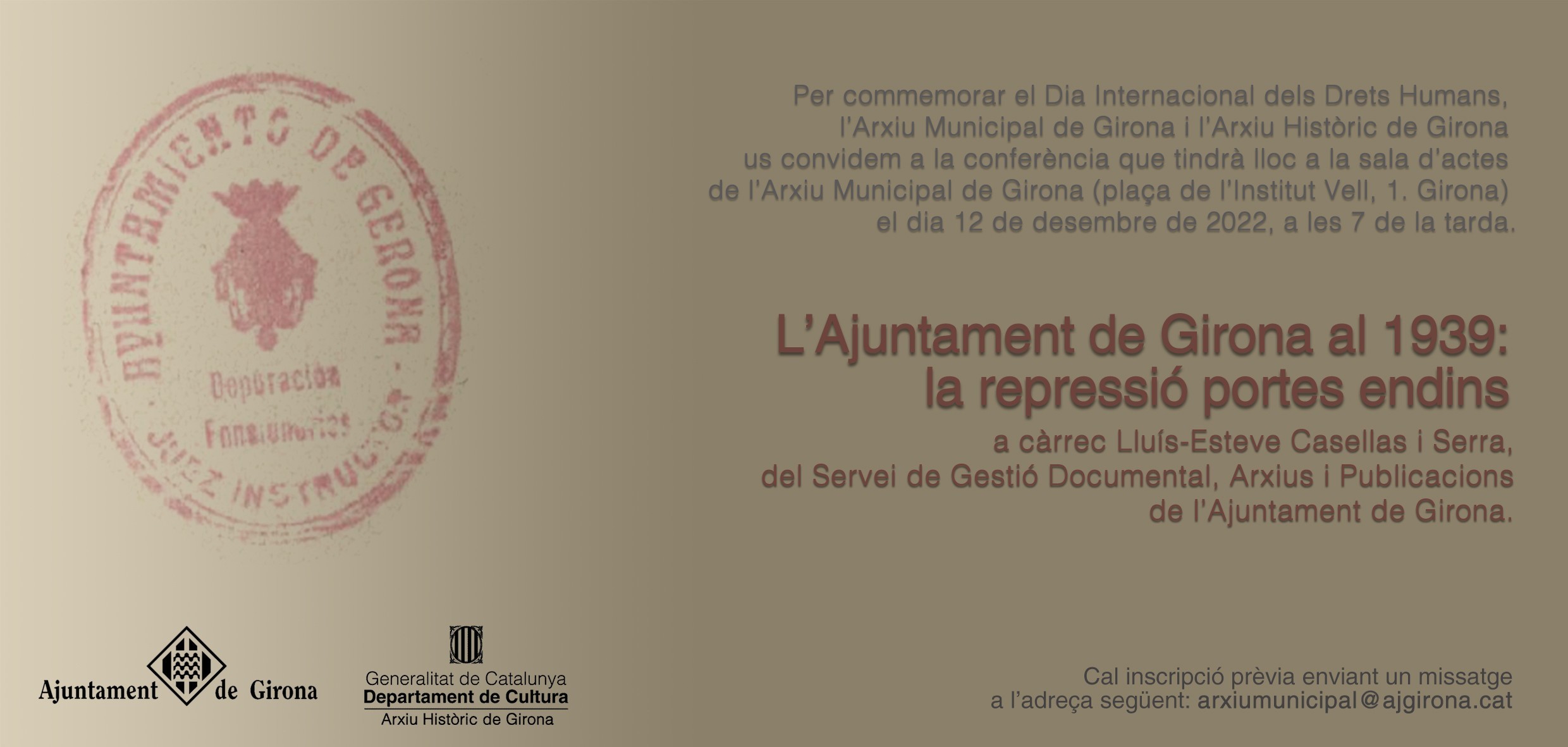 Per commemorar el Dia Internacional dels Drets Humans, l'Arxiu Municipal de Girona i l'Arxiu Històric de Girona organitzen la conferencia L'Ajuntament de Girona al 1939, la repressió portes endins a càrrec de Lluís-Esteve Casellas, cap de la Secció de Gestió Documental i Arxiu de l'Ajuntament de Girona.