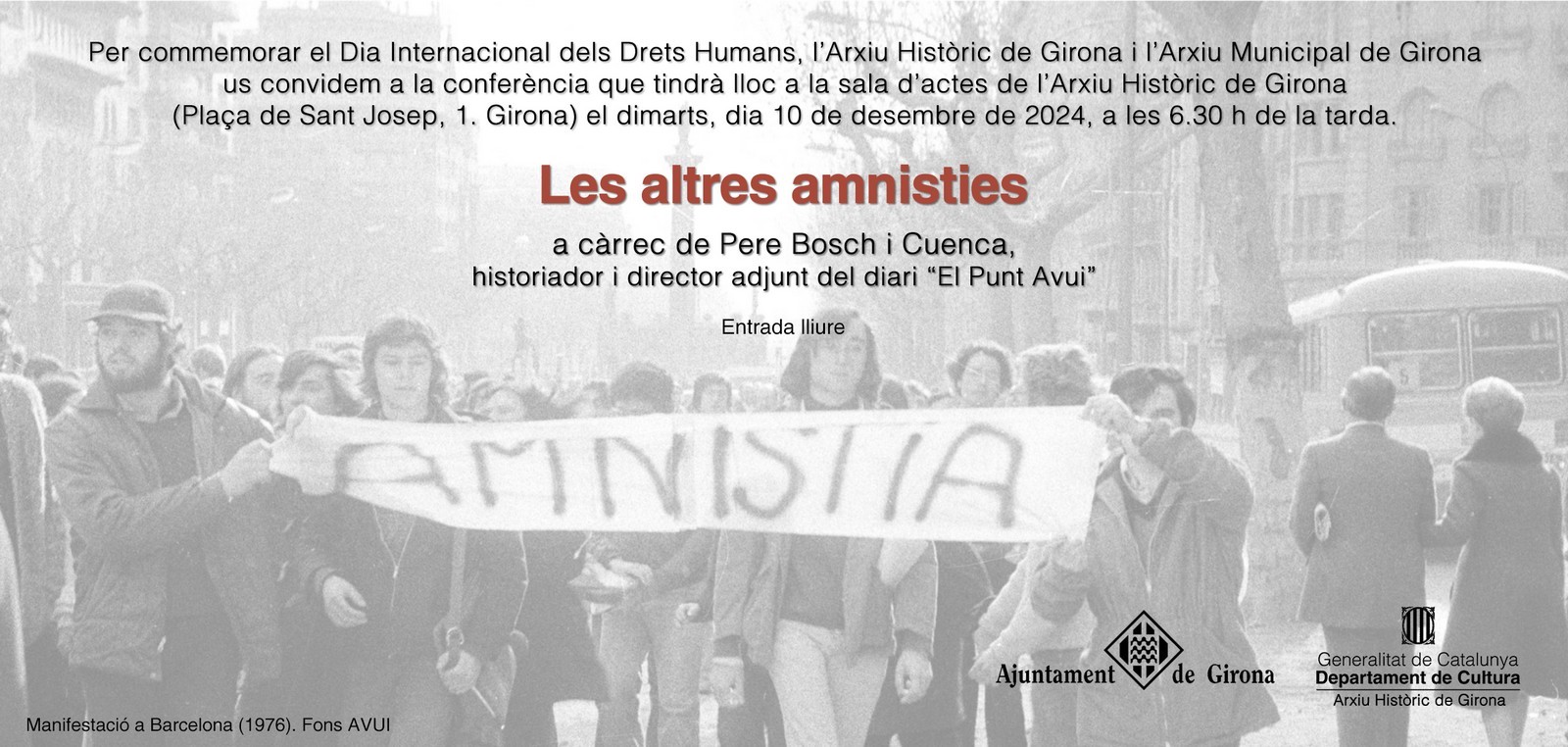 Per commemorar el Dia Internacional dels Drets Humans, l'Arxiu Municipal de Girona i l'Arxiu Històric de Girona organitzen la conferencia Les altres amnistiesistoriador i director adjunt del diari El Punt Avui.