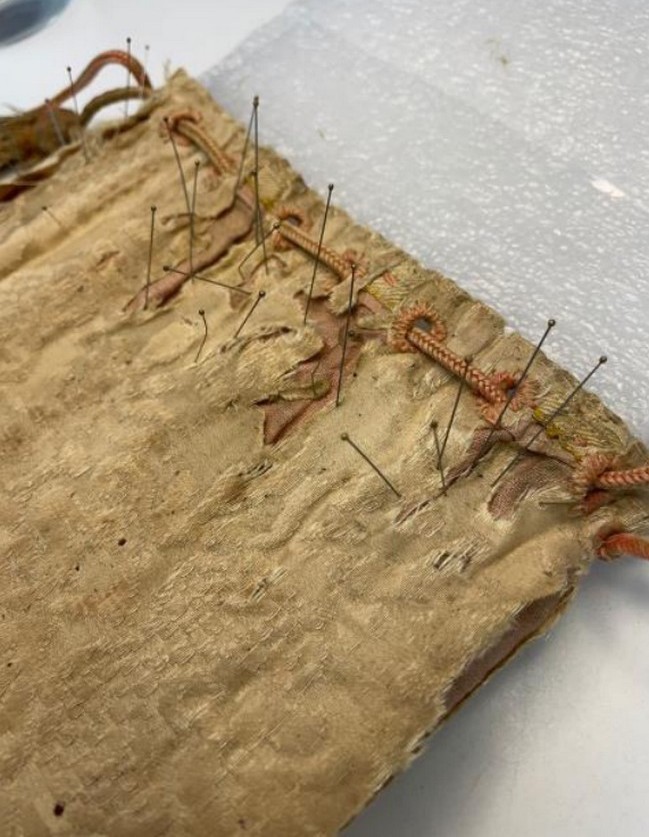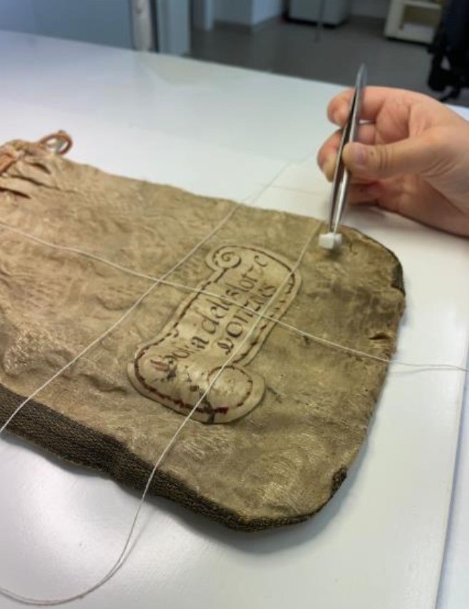 La bossa fou restaurada entre maig i juliol de 2023 per Elisabet Cerdà i Margherita Barone, tècniques del taller de restauració del Centre de Documentació i Museu Tèxtil de Terrassa. El tractament de conservació de la bossa va comportar la seva neteja, tant superficial com humida; la consolidació del suport, recosint algunes parts i aplicant teixit semitransparent de protecció en les zones que ho requerien; i la unió del cordó de tancament, que estava trencat.