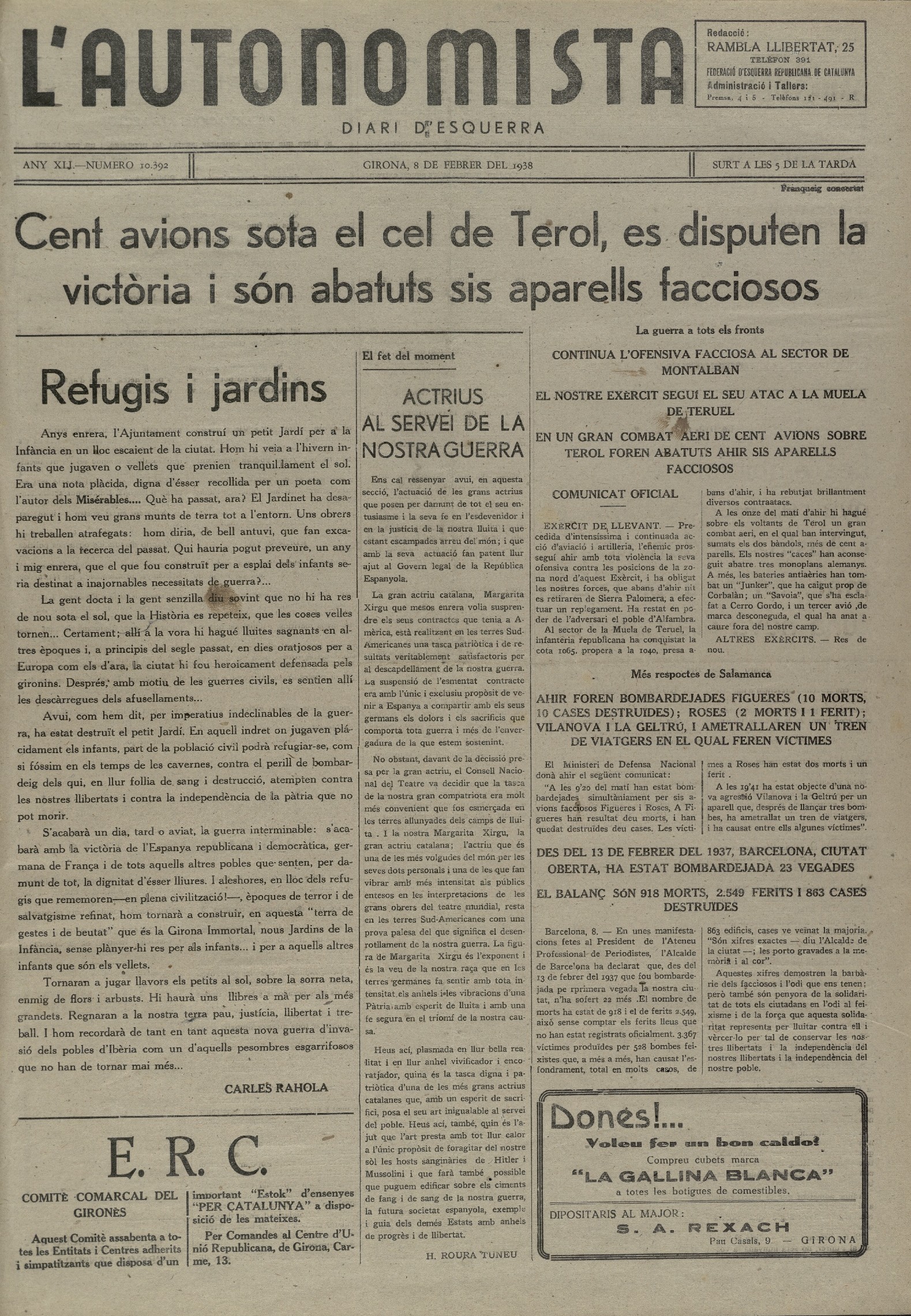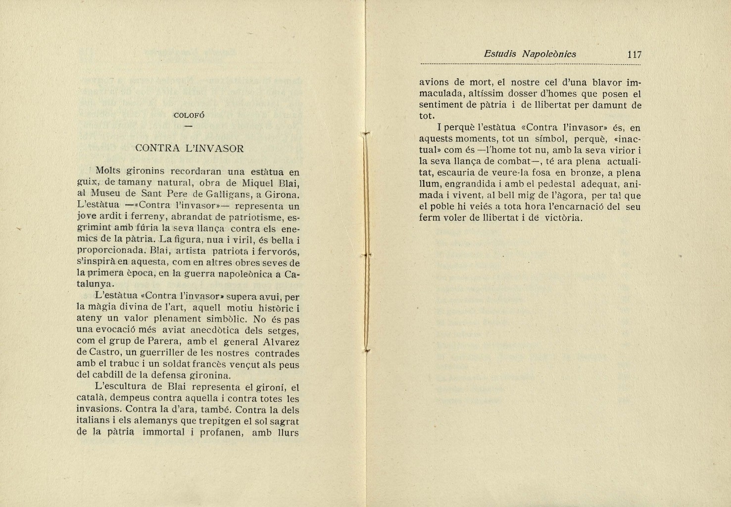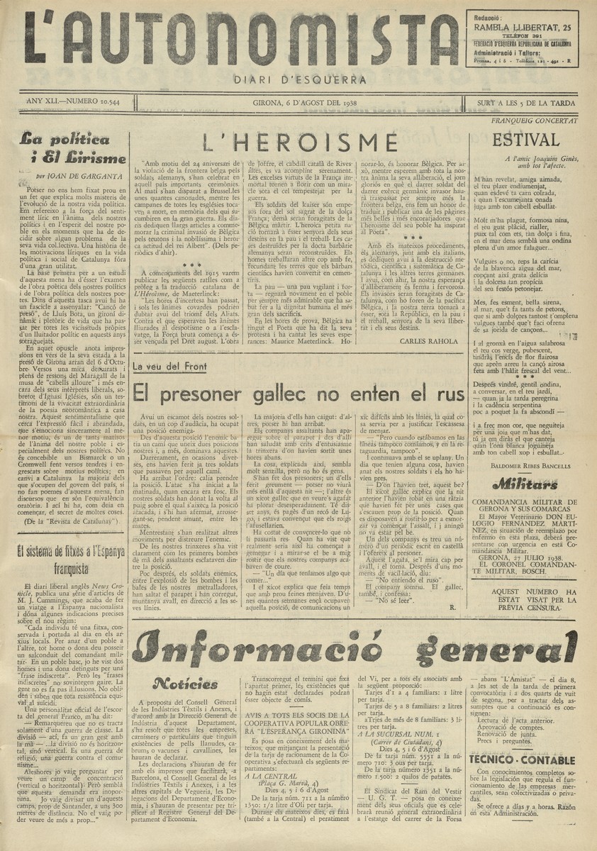 L'article "Refugis i jardins" havia aparegut a la portada del diari L'Autonomista, de 8 de febrer de 1938, i "Heroisme", a la portada de 6 d'agost de 1938 de la mateixa capçalera. El text "Contra l'invasor" era el colofó de la seva obra Estudis napoleònics, publicada a Girona la tardor de 1938; tement algun problema, ell mateix n'arrencà les pàgines dels exemplars que tenia a casa abans no fou detingut.