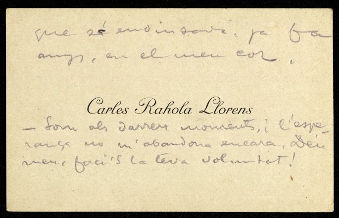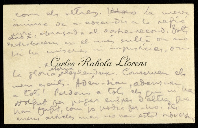 El dia 14 de març a les 11 de la nit Carles Rahola abandonà la cel·la i fou posat en capella, l'habitació on s'estaven els condemnats a mort la nit anterior a la seva execució. Va demanar l'assistència d'un notari, en concret del seu amic Jaume Genover i Codina, per a fer testament i, així, poder passar les seves darreres hores en companyia d'un amic. També l'acompanyà mossèn Evarist Feliu, capellà de la presó, que li deixà una ploma estilogràfica i una petita llibreta de 88 x 140 mm on Rahola va escriure el seu comiat a la família.