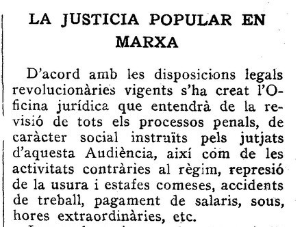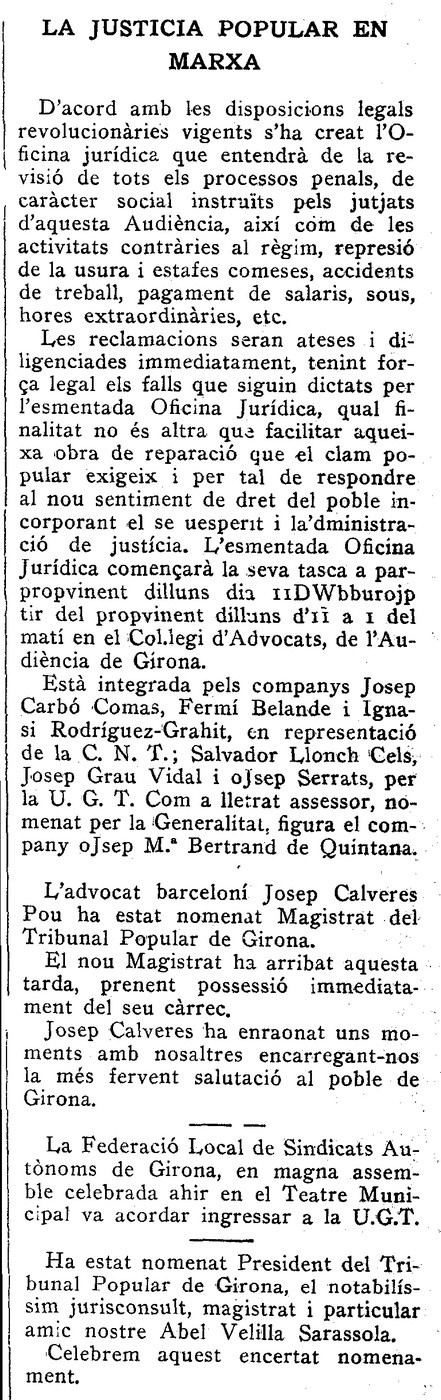 El setembre de 1936, amb la voluntat de posar fi a aquesta violència incontrolada, es constituí el Tribunal Popular de Girona que havia de jutjar els actes contra el règim revolucionari i també altres delictes. Fou aquest tribunal el que jutjà 50 militars que s'havien adherit a la insurrecció i condemnaren a mort set dels acusats. La resta foren condemnats a diverses penes de presó o absolts.